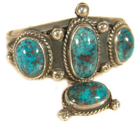 Unique style turquoise and silver bracelet set with four matching stones, one attached on a hinged platform. Condition: very good. 5-1/2" plus 1-7/8" gap x 2" wide