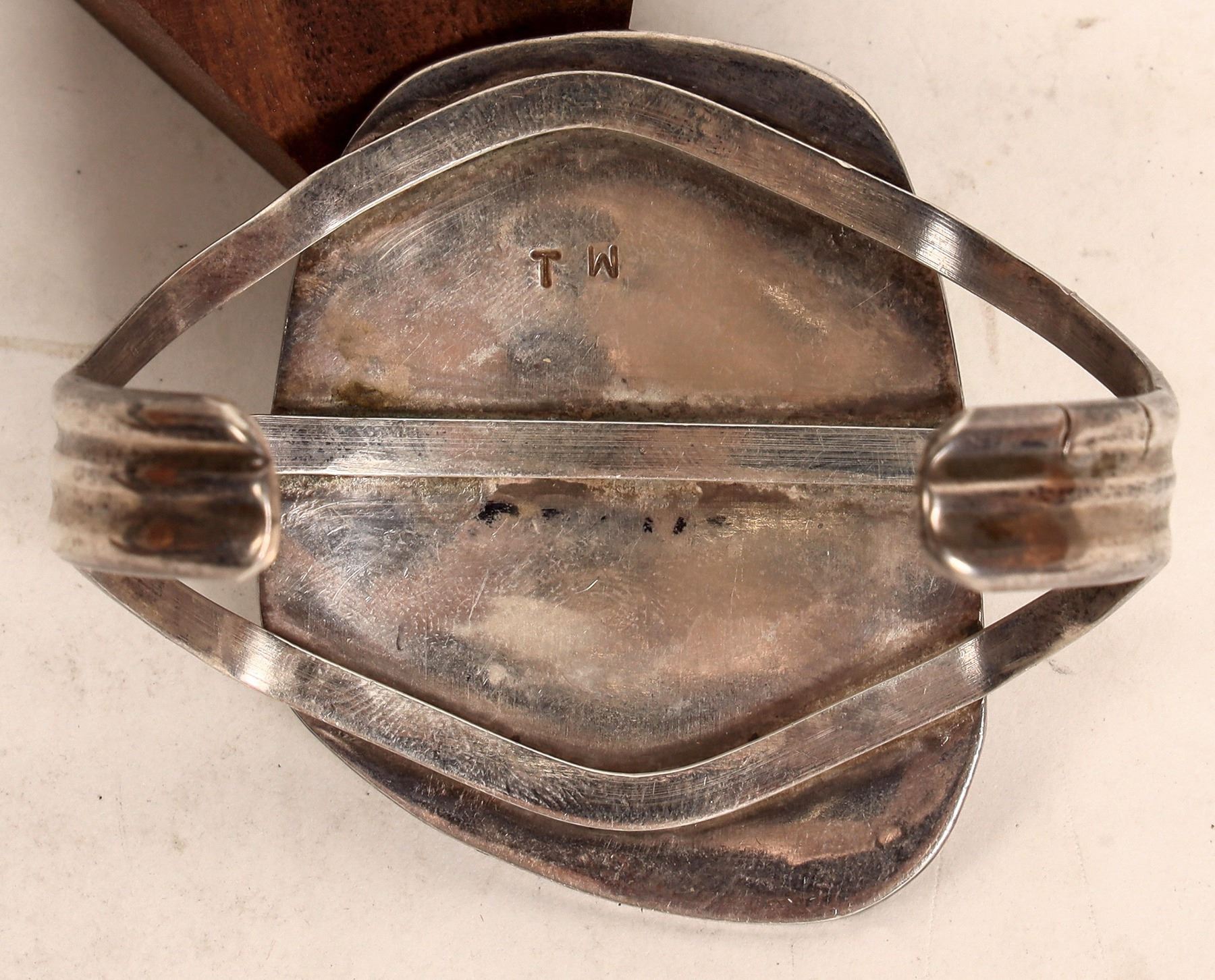 Navajo turquoise bracelet and three rings . All have a brown matrix. The bracelet has a bead design with the initials TW inside. The bracelet is approximately 2.5 x 2.5 inches. The rings are oblong in shape one is a bead design, one is a rope design and one is a shadow box design. A very nice collection. Ring sizes as pictured from left to right: 6.5, 7, 8 From the Frank Lewton Collection 1975. [] [] [] [] []
