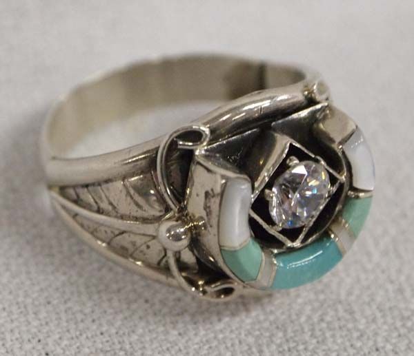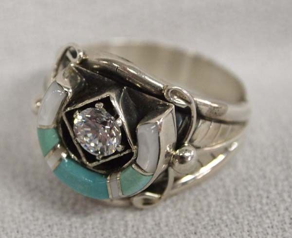 Navajo Turquoise CZ Ring by Wilbur Yazzie, Size 9, measures .5''L, hallmarked Wil and stamped sterling, 5g in total wt. Stunning piece!