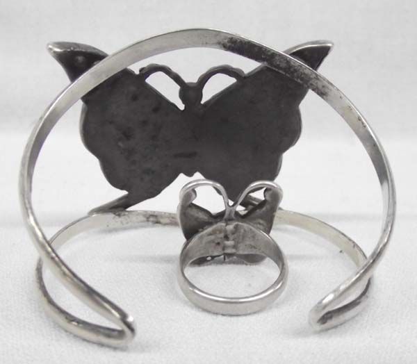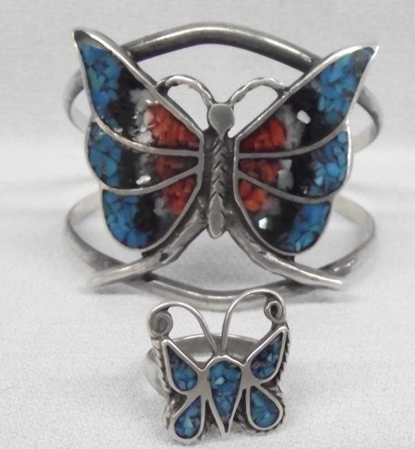 Native American Navajo Turquoise Chip Inlay Bracelet and Ring. Two charming butterfly pieces. The bracelet has chip inlay of turquoise, jet, mother of pearl and coral in the wing sections which are separated by a silver channel. It measures 5.75'' inside including opening and the butterfly measures -1-7/8''x1.5''. The ring has turquoise chips and is a size 5.5 with the butterfly measuring 3/4''x1/2''.