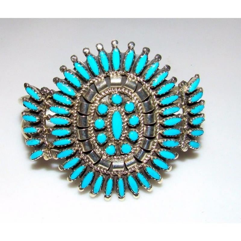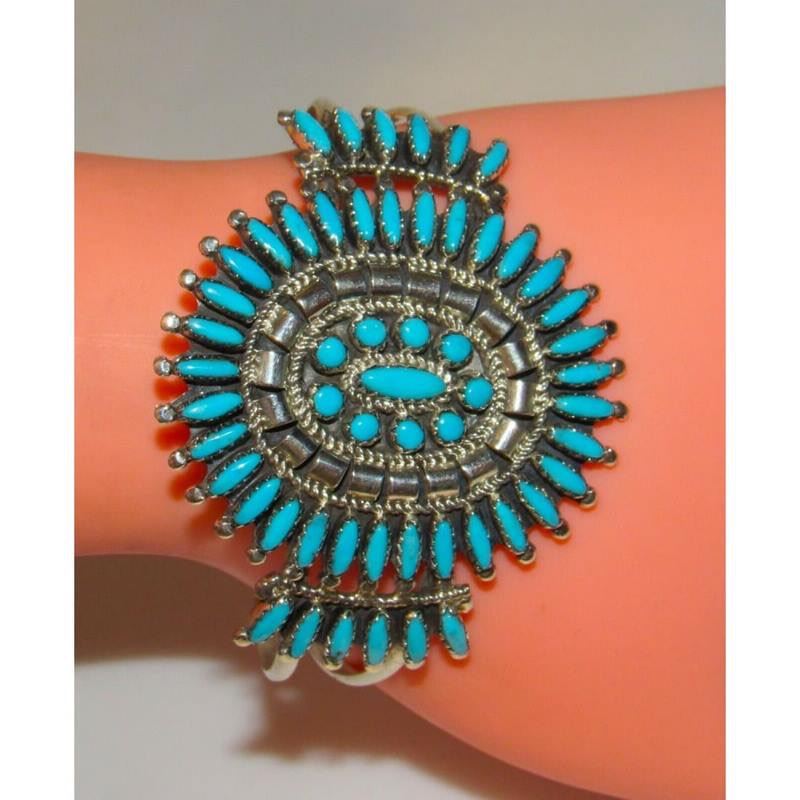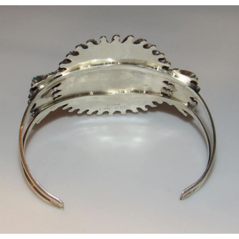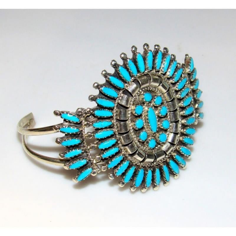 For your consideration is this stunning Navajo sterling silver, and Sleeping beauty mine turquoise cluster statement cuff bracelet. Exceptional craftsmanship and attention to detail. The inside circumference is about 7" including gap; the gap measures 1 1/4". The cuff is about 2" wide at the widest point. Can be carefully adjusted. Signed by the artist and stamped sterling. Fab example of collectible Native American art to add to any jewelry collection! FREE SHIPPING ON ALL JEWELRY ORDERS WITHIN THE US! WE SHIP ALL ITEMS IN-HOUSE!