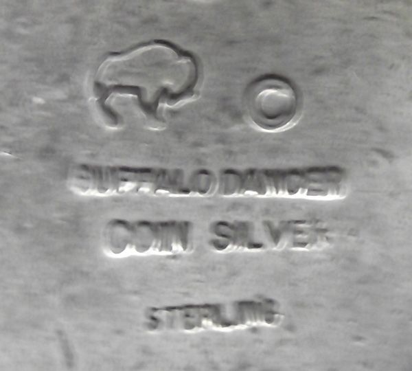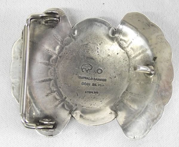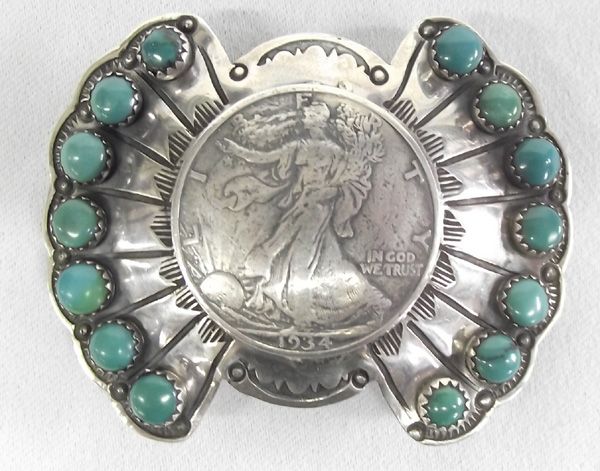 Navajo Turquoise Coin Silver Buckle Buffalo Dancer. Vintage belt buckle with silver dollar in the center, surrounded by silver feathers and turquoise cabs. Stamped on the back, ''Bufffalo Dancer Coin Silver Sterling'' and with a buffalo hallmark. Measurse 2-5/8''W x 2''H.