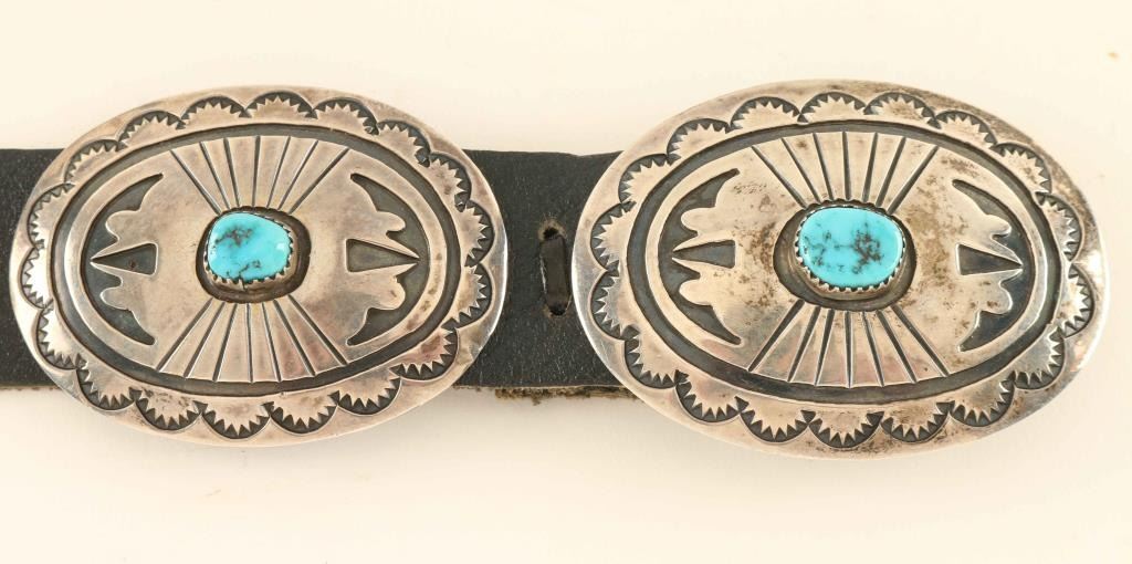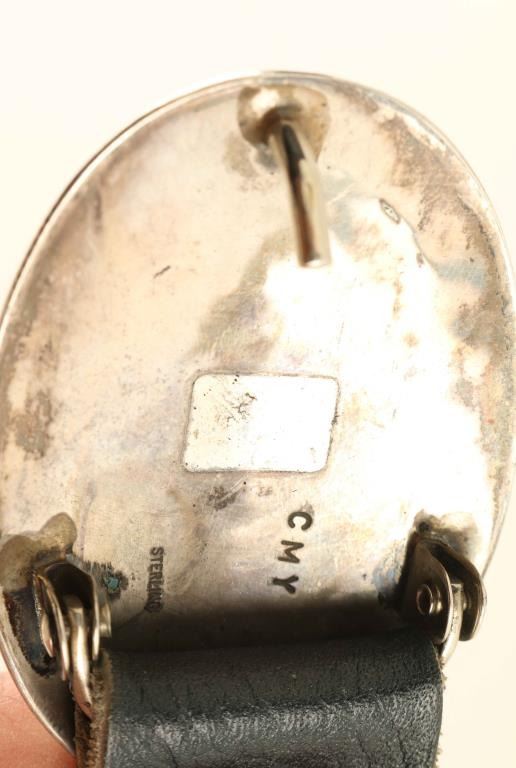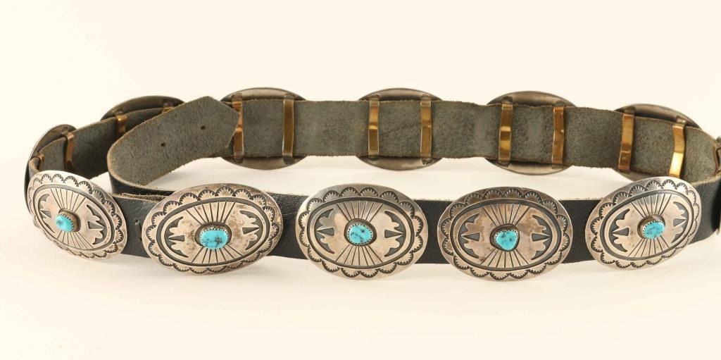 Twelve conchos including buckle, each oval concho shows a geometric design with a single turquoise stone. All sterling silver, hallmarked 'CMY', on black leather belt measures 36" end to end.