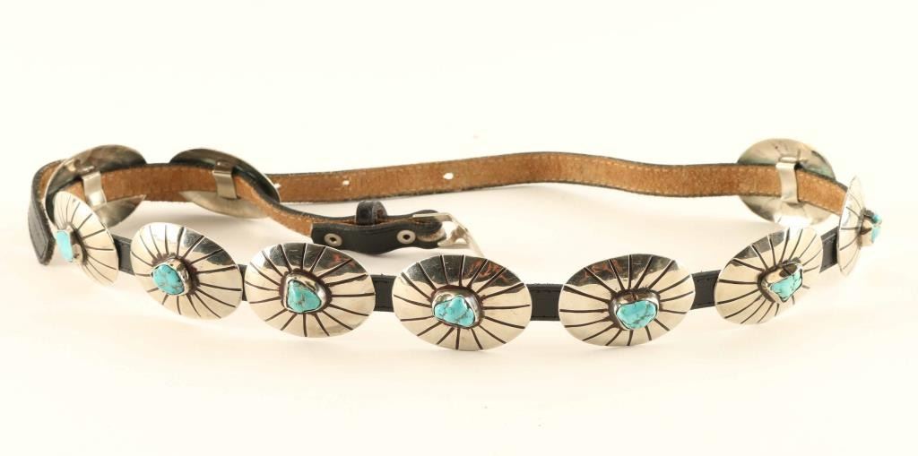 Ten conchos and small buckle, each oval concho shows a burst design with a single turquoise stone. All sterling silver, on black leather belt measures 34" end to end and 1/2" wide.