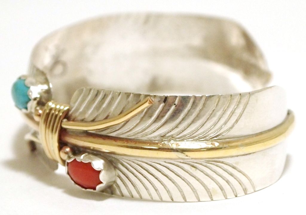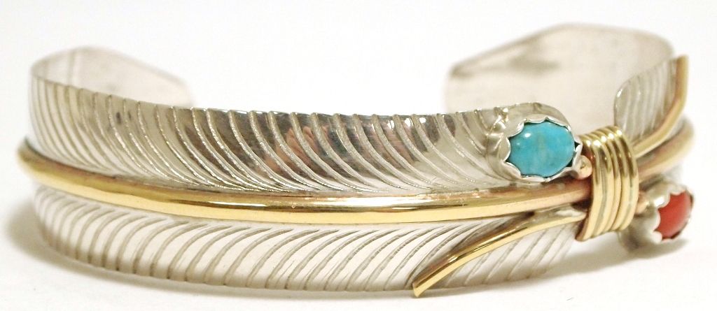 Navajo Turquoise & Coral 12k Gold Fill over Sterling Silver Feather Cuff Bracelet - Virgil Reader