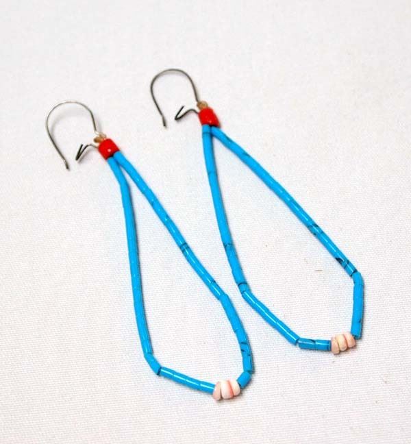 Native American Navajo Turquoise Coral & Shell Heishi Earrings, measures 3.75''L (which includes wire) x .75''W