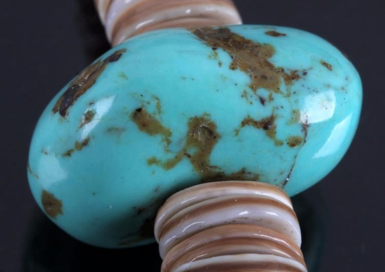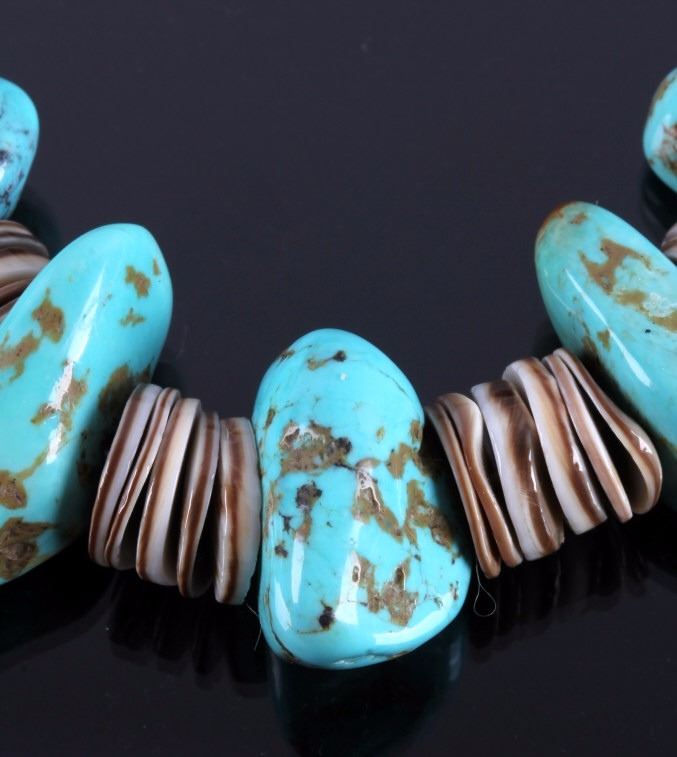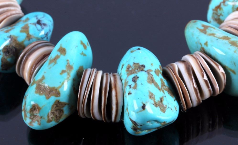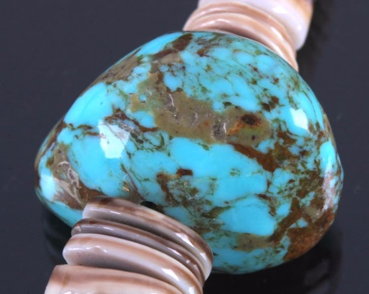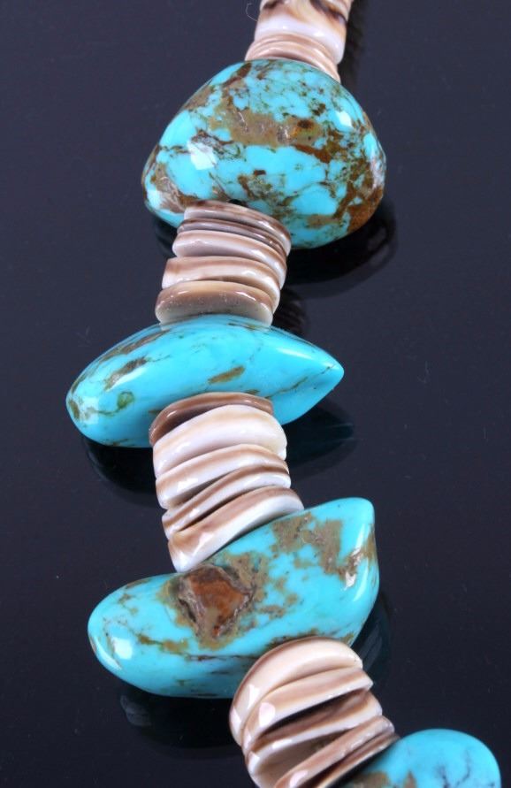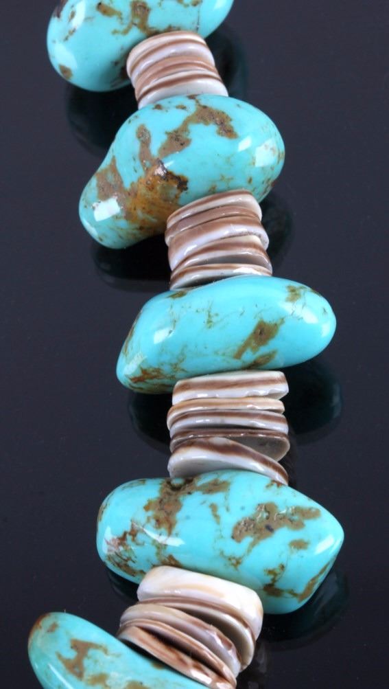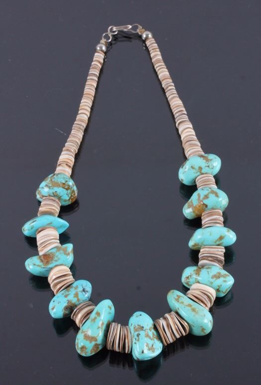 This is a Navajo turquoise nugget and discoidal shell necklace. The necklace features 11 large Cripple Creek Turquoise nuggets set apart by discoidal shell beads. The Navajo necklace is in good condition. It measures 14.5" long.
