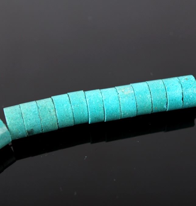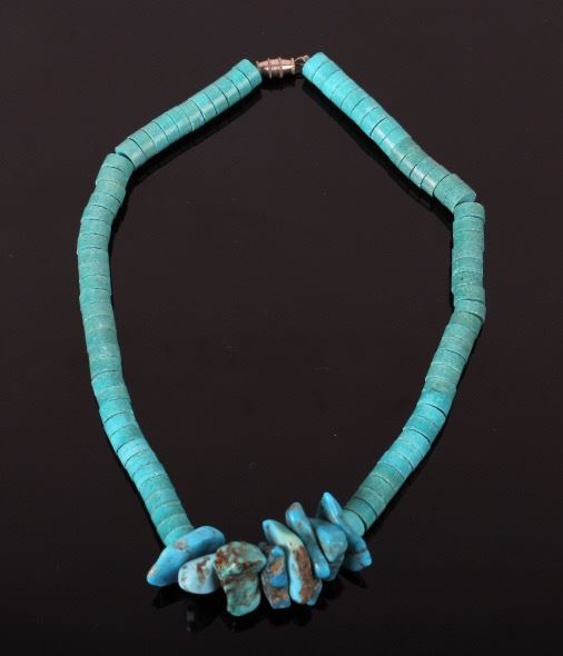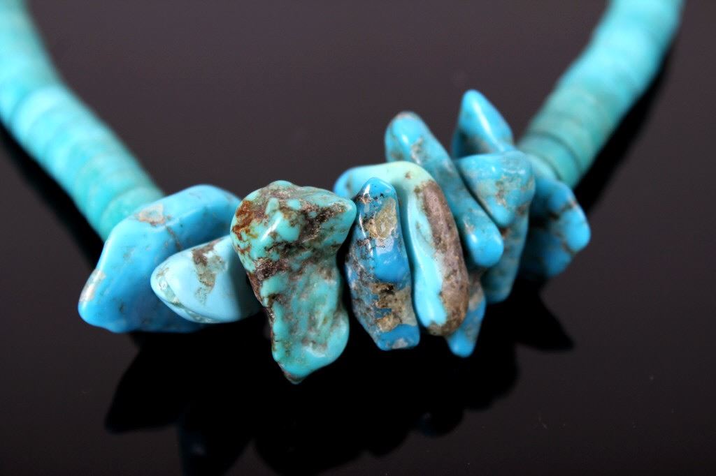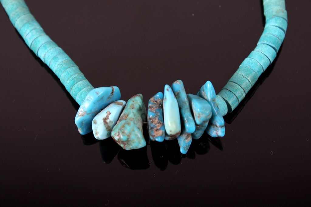 Available in this lot for your consideration is a gorgeous Navajo Native American Turquoise necklace. The necklace is composed of eight turquoise nuggets including Sleeping Beauty, Turquoise Mountain, and Cripple Creek turquoise. The nuggets are capped on each end with eighty Turquoise Mountain Heishe beads. The necklace shows good condition and when unclasped measures 15 1/2".