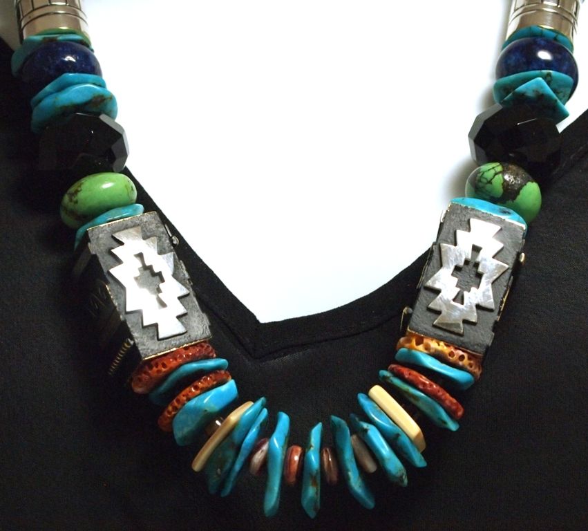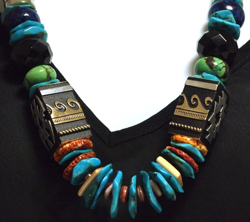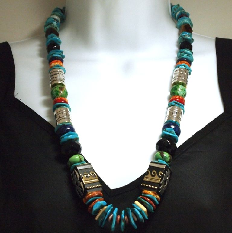 Measures 26" around by from 3/8" to 5/8" wide. Stones present: Onyx, Turquoise, 12k Gold Fill & Sterling Silver Beads, Coral, Green Turquoise, Malachite, Tiger's Eye, Spiny Oyster, Lapis Lazuli.
