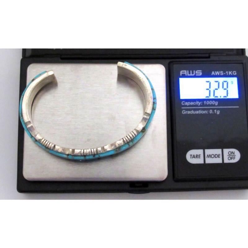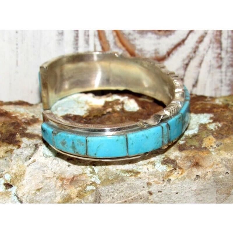 For your consideration is this stunning Navajo sterling silver, and Sleeping Beauty mine turquoise inlay statement cuff bracelet by the collectible artist Steve Francisco. Exceptional craftsmanship and attention to detail. Measures about 1/2" wide. Asymmetric design with one side wider than the other. The total inside circumference is about 6 1/2" with the gap. The gap is about 1 1/2". Signed and stamped sterling. Superb example of collectible Native American art to add to any jewelry collection! Fab statement piece!