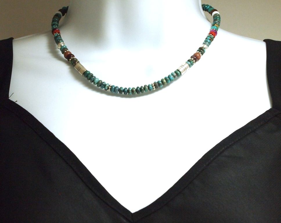 Measures 16" around by 1/4" wide. Stones present: Turquoise, Sterling Silver beads, Coral, Spiny Oyster, Tiger's Eye, Marble, Howlite.