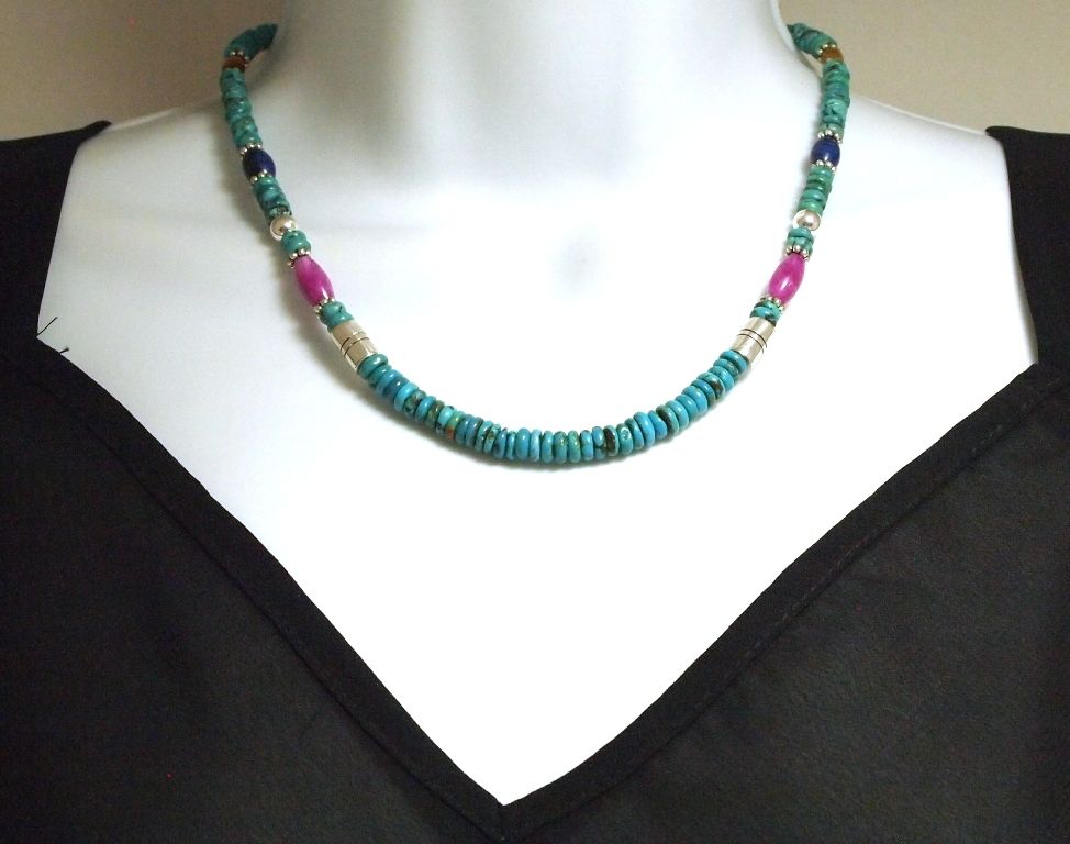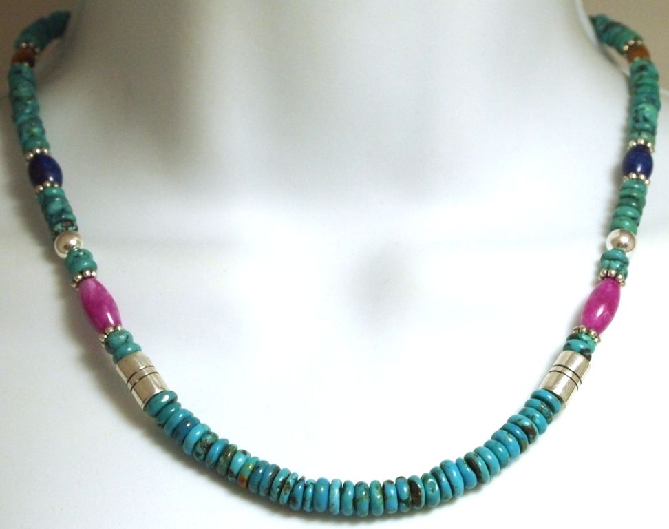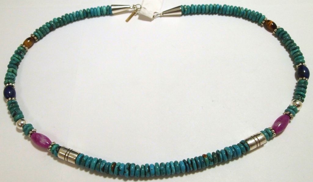 Measures 17" around by 1/4" wide. Stones present: Turquoise, Sterling Silver Beads, Lapis Lazuli, Sugilite, Tiger's Eye.