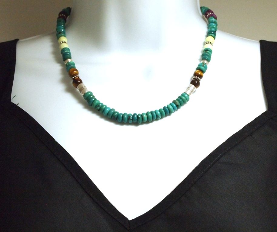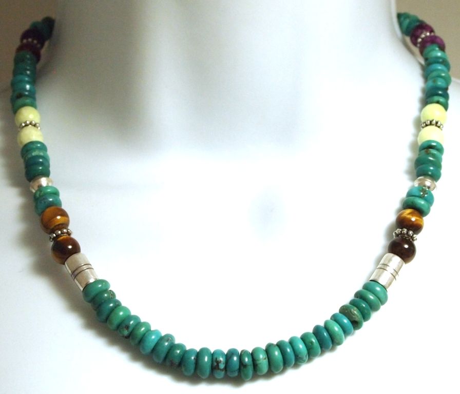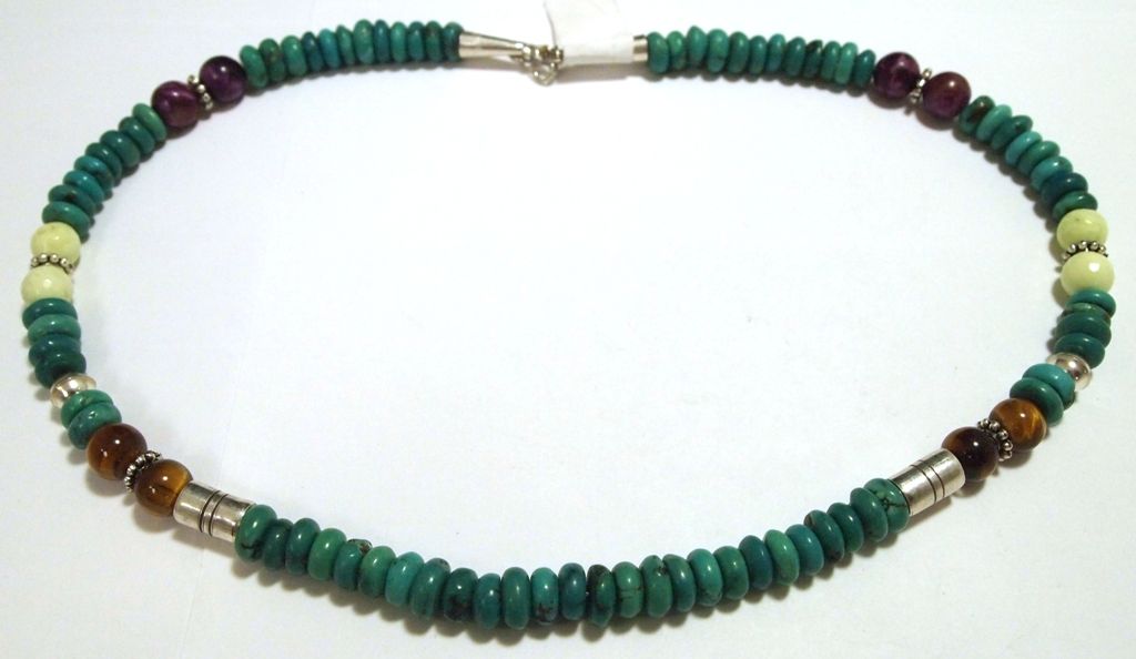 Measures 18" around by 5/16" wide. Stones present: Turquoise, Sterling Silver beads, Tiger's Eye, Serpentine, Spiny Oyster.