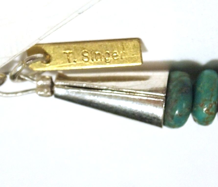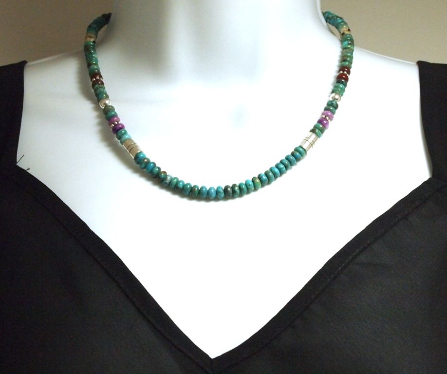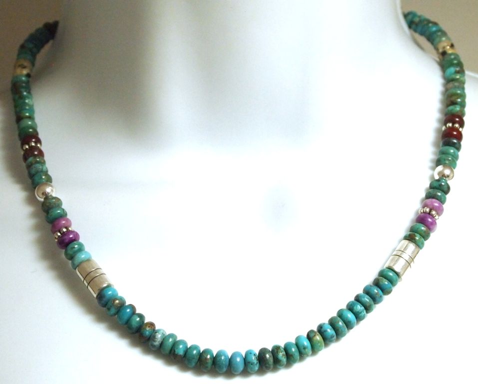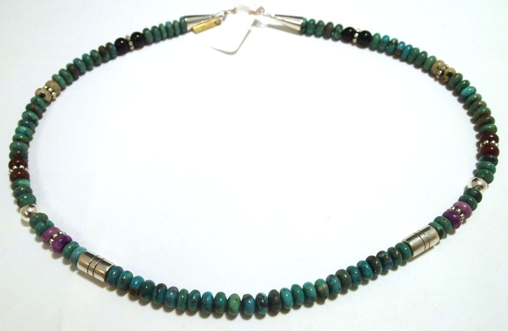 Measures 18" around by 1/4" wide. Stones present: Turquoise, Sterling Silver beads, Onyx, Marble, Spiny Oyster.