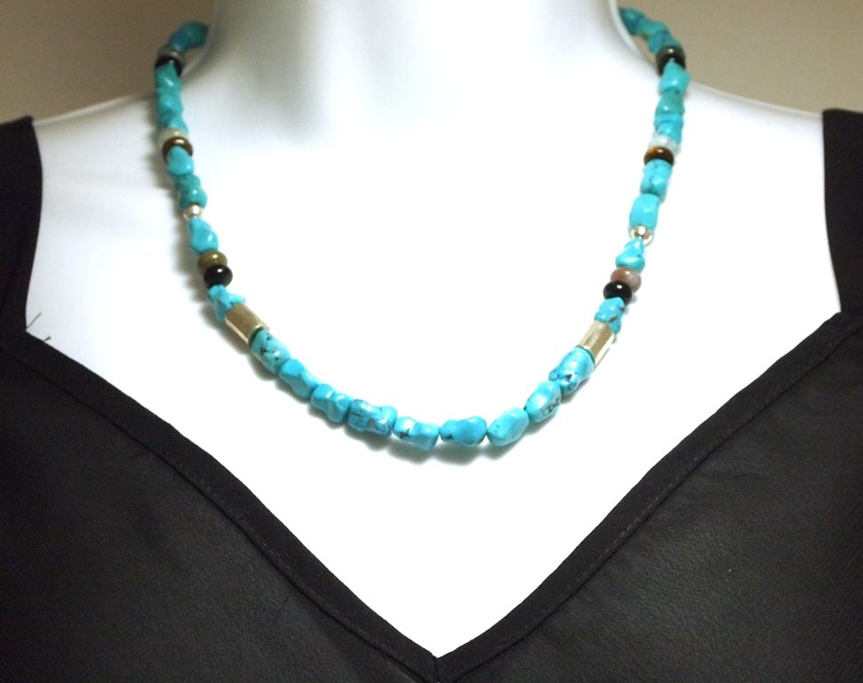 Measures 18" around by 1/4" wide. Stones present: Turquoise, Onyx, Tiger's Eye, Glass.