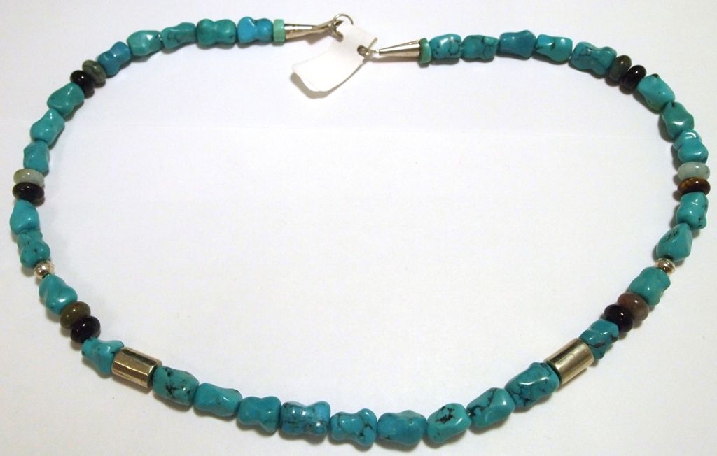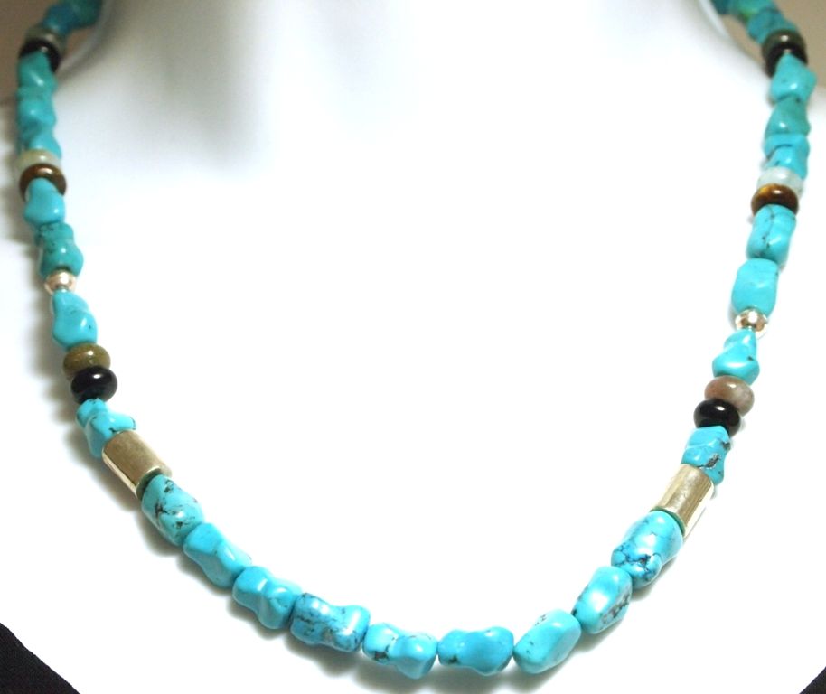 Measures 18" around by 1/4" wide. Stones present: Turquoise, Onyx, Tiger's Eye, Glass.