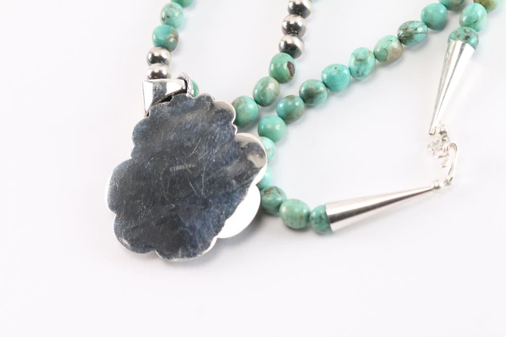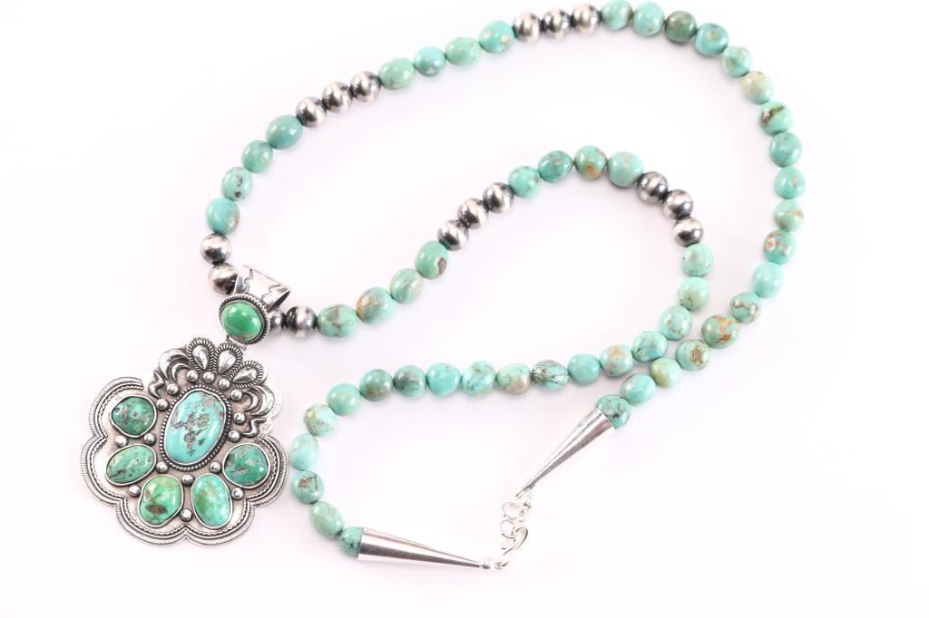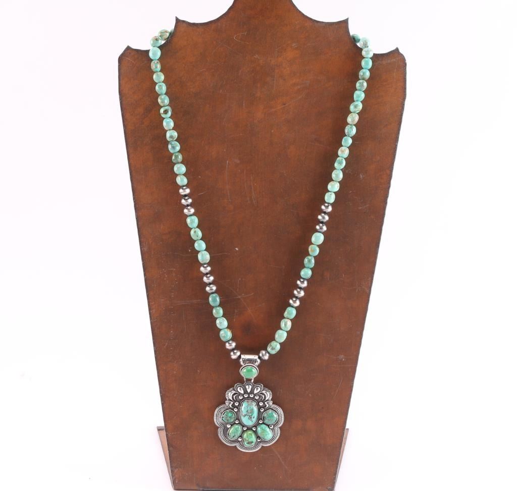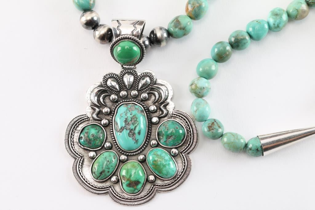 Beaded turquoise necklace and Navajo pearls featuring a large pendant with a cluster design set in sterling silver.