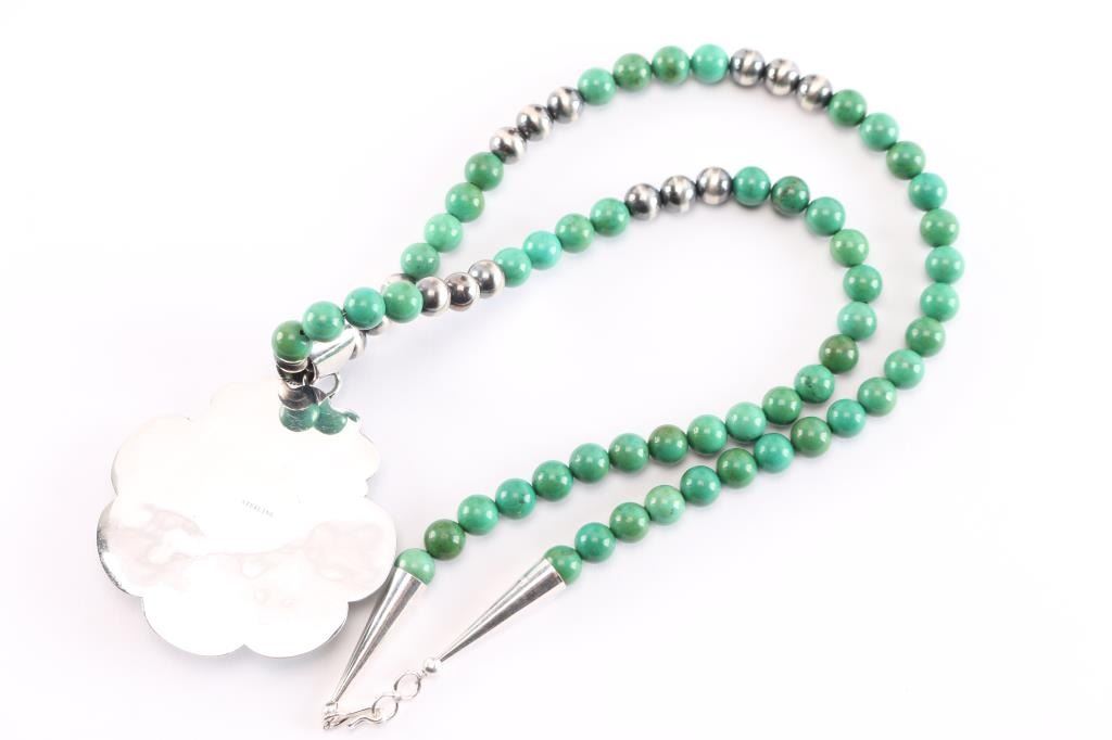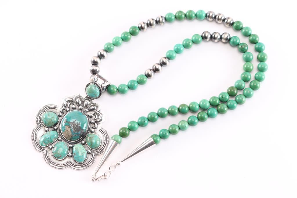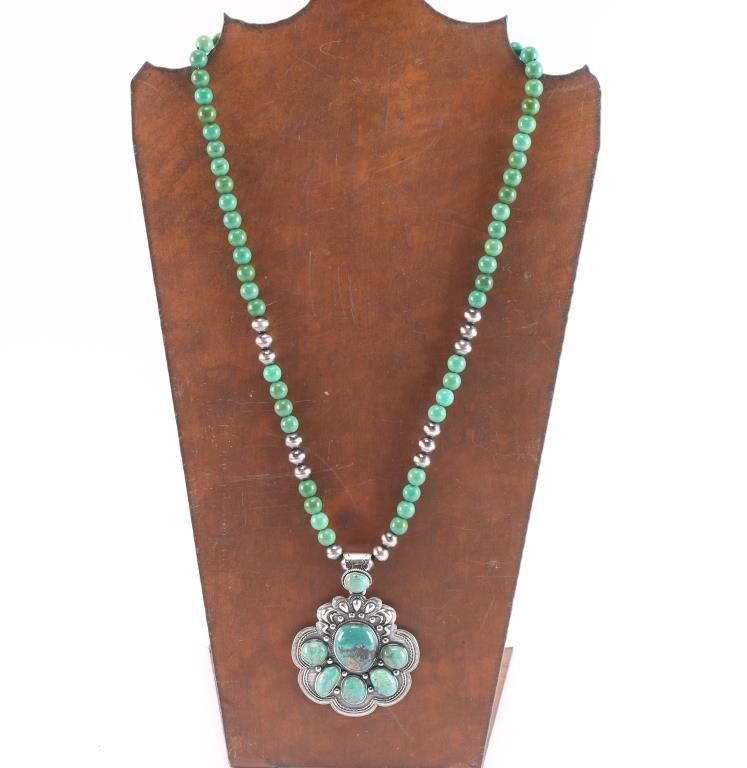 Turquoise round bead necklace with large cluster pendant with turquoise set in sterling
