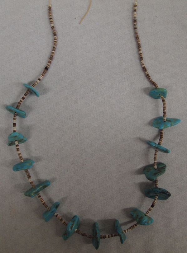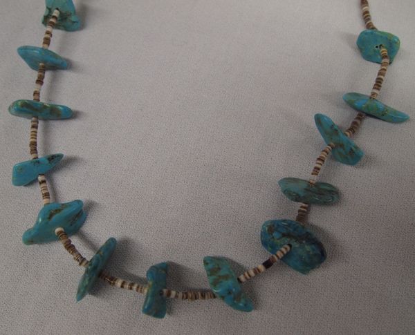 Navajo Turquoise Nugget Heishi Necklace.  Over the head necklace with natural Bisbee turquoise nuggets and puka heishi, string tied.  Necklace is 27'' long.  Largest nugget is 1''.