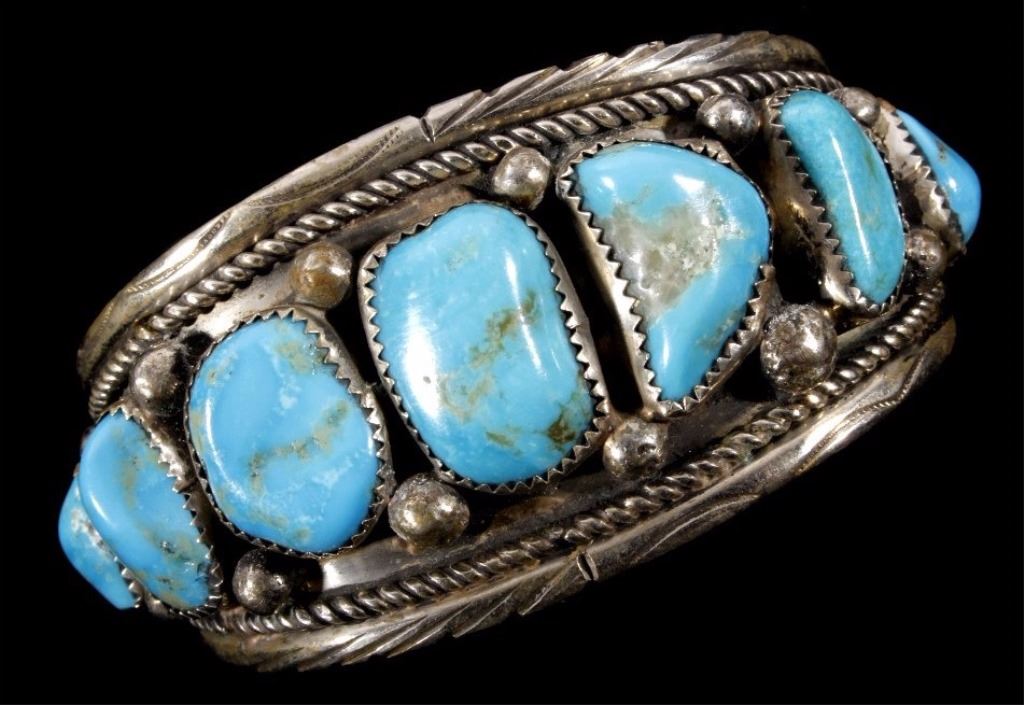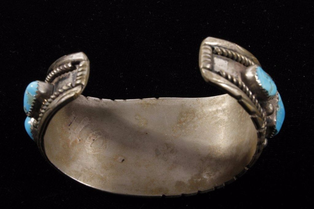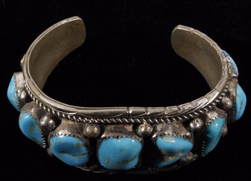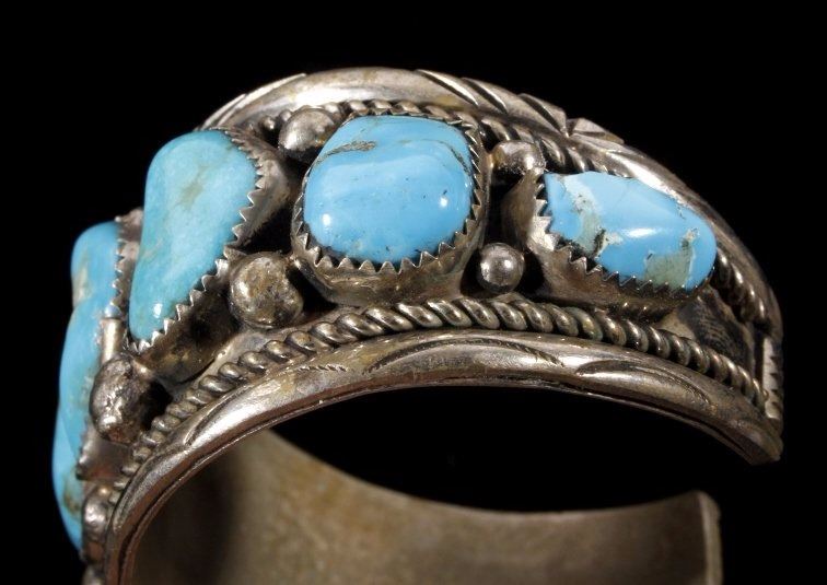 This is a Navajo Native American Indian Turquoise nugget and Old Pawn Silver bracelet or cuff. The early piece shows wonderful bright turquoise polished nugget stones with a wonderful worked silver construction and rope silver. The piece shows good condition. Measures (shipping) 1.5" x 3"W x 1 7/8"H with a 6.5" inside circumference wrist size.