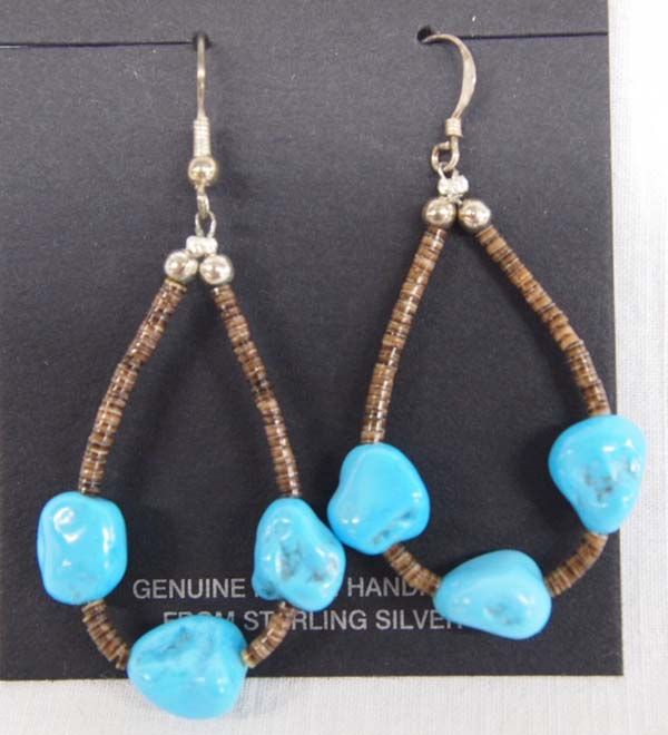 Navajo Turquoise Nugget and Heishi Bead Earrings, measure 2.5''L x 1''W, each earring features 3 turquoise nuggets each measuring .25'' x 3/8'' and heishi beads, silver bead accents