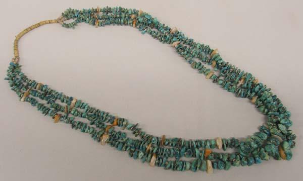 3 Strand Turquoise Nugget Necklace with Spinney Oyster Heishi and Chunk Spacers. String tied. Measures 32'' SHI $15.