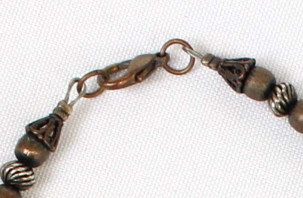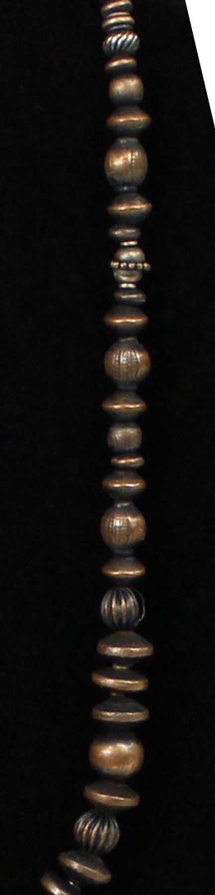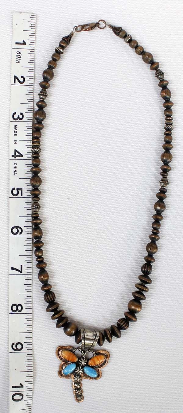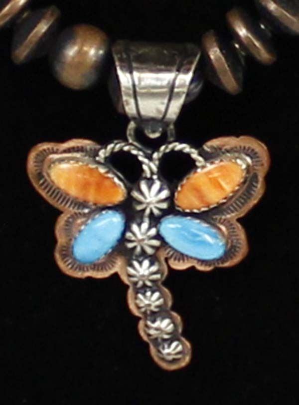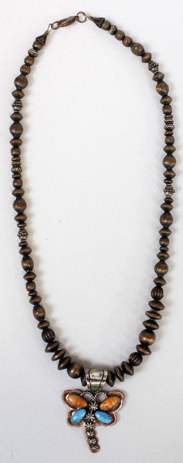 Native American Navajo Copper, Sterling, Turquoise & Orange Shell Dragonfly Necklace by Daniel Mike, hallmarked and sterling, pendant measures 2'' x 1.5'' and has sterling bale, body, and antennae, copper bench bead necklace measures 19''L end to end, total gram wt. of 45.64