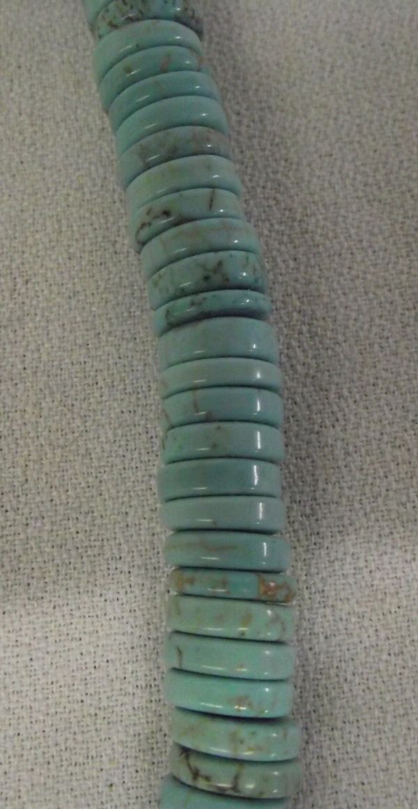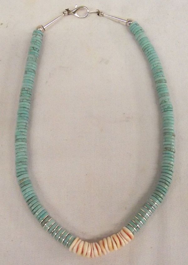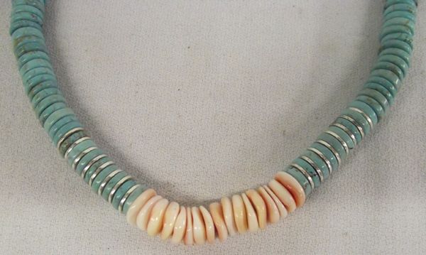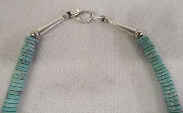 Navajo Turquoise Puka Shell Necklace, Turquoise rondelle beads, puka shell, silver spacer beads, cones, and clasp, beautiful necklace, measures 22'' end to end