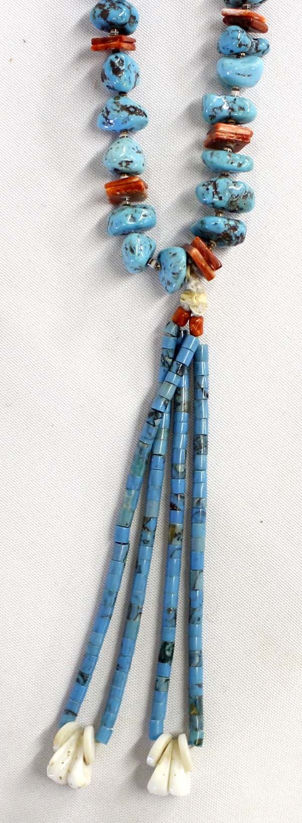 Native American Navajo Turquoise & Red Shell Jocla Necklace, measures 30''L end to end, string tied, white mother of pearl ''corn'' beads
