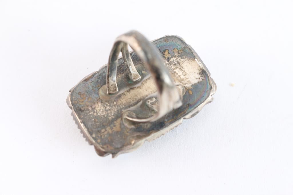 Rectangle cut turquoise stone. Set in sterling silver. Maker marked. Size 8. 11 grams with stone.