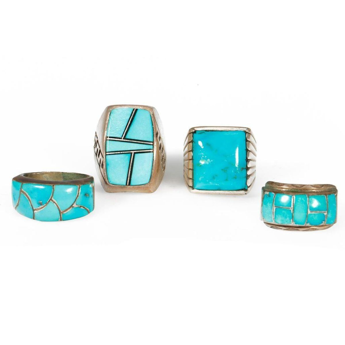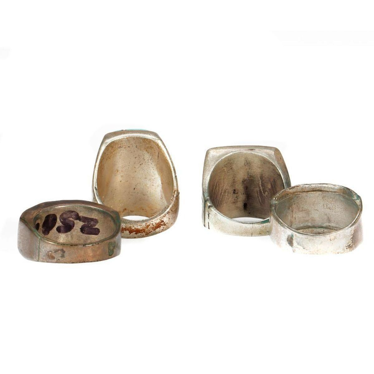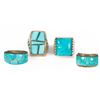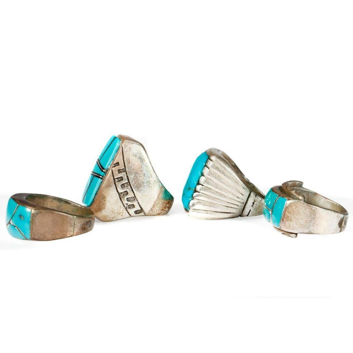 Old Pawn Southwest jewelry, consisting of a miscellaneous grouping of 4 silver and turquoise rings. Approximate size: 1 inches in length largest example. Rings sizes range from approximately: 7 1/2 , 8 1/2, 9 1/2. Approximate total weight: 65 g.