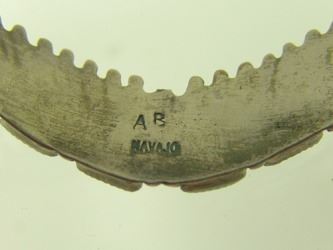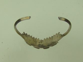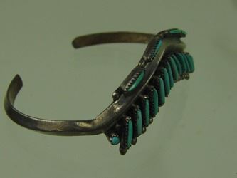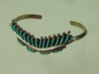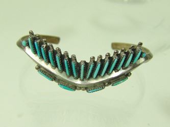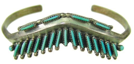 Delicate, Zuni style needle point bracelet done in chevron form on a single, 3 - sided silver band. Very good condition. Late 1900s. "5" + 1-3/8" gap x 3/4" wide.