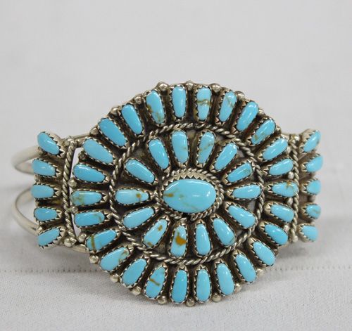 Navajo Turquoise Silver Cluster Bracelet by artist P. Benally (hallmarked PB). Gorgeous robin's egg blue turquoise cluster bracelet. Measures 1.75'' wide and 6.5'' inside including opening. Artist's hallmark on the inside, ''PB''.