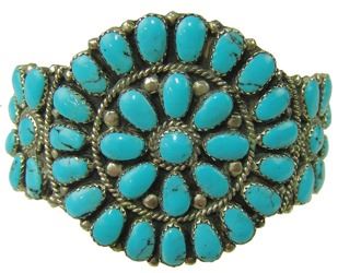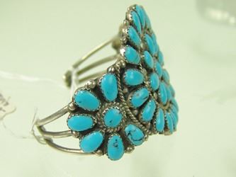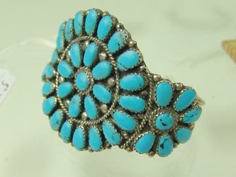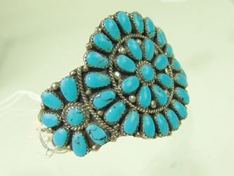 Classic, cluster design cuff bracelet with 42, individually hand cut and set, light blue stones. Very good condition. Mid/Late 1900s. 5" + 1-1/4" gap x 2" wide.
