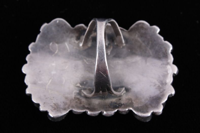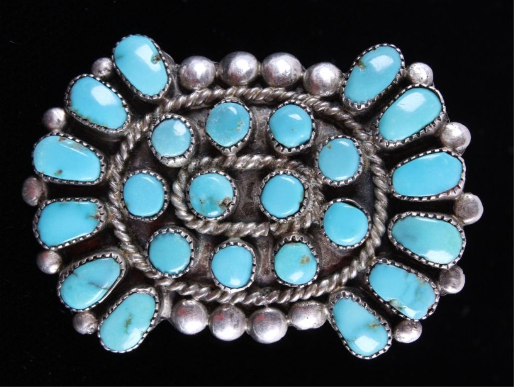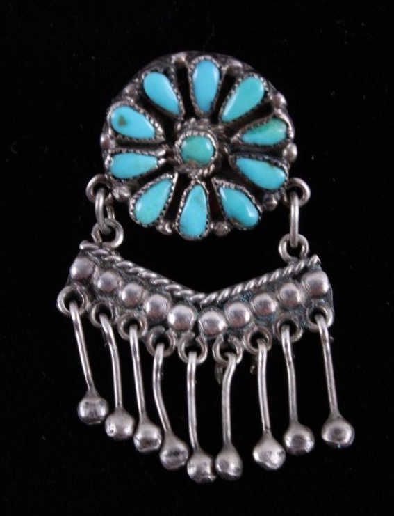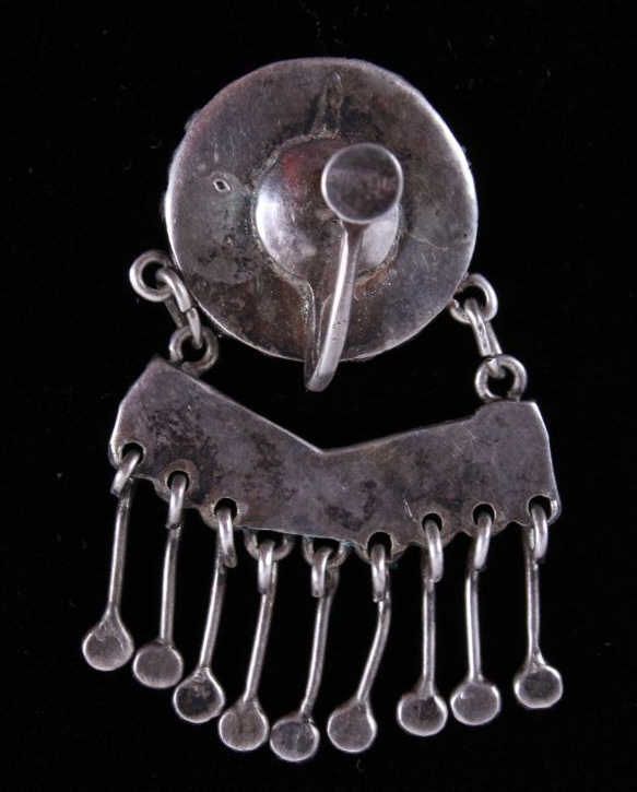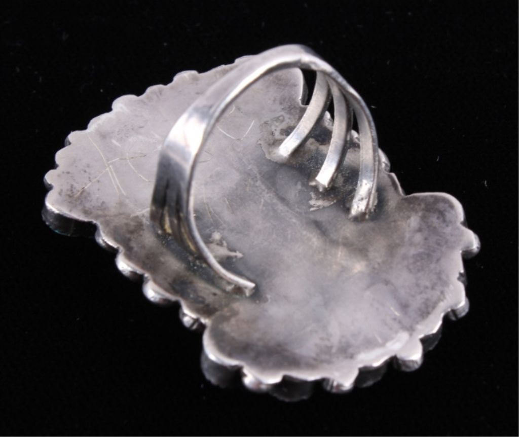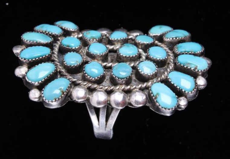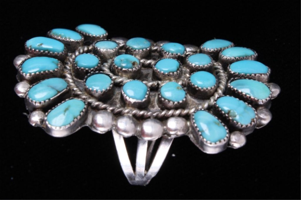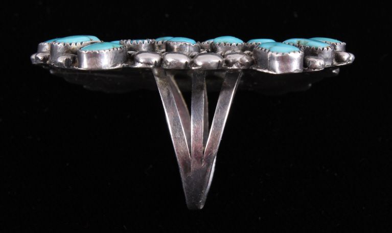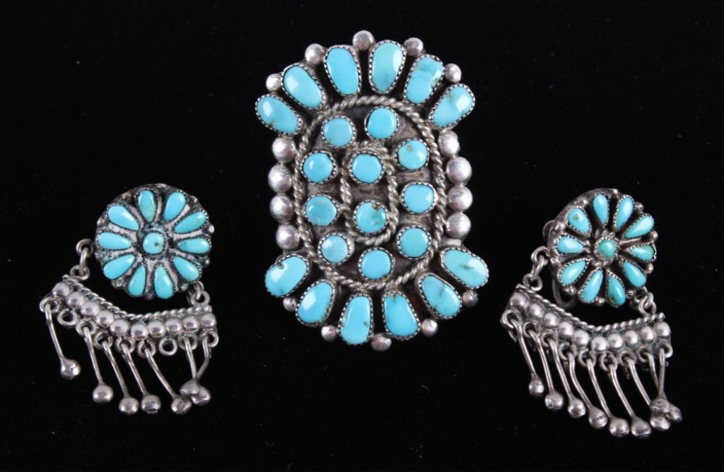 This is a matching set of hand crafted Navajo Native American Indian earrings and ring. The ring shows a rarely seen larger size showing 23 set bright turquoise stones set on a worked silver ring with wonderful rope center framing. The earrings shows a round turquoise set center with hanging silver pieces. These are Navajo pawn pieces believed to be from the 1930's. Ring is 2"x1 3/8" size 10.5. Earrings 1"x1.75" marked sterling (one is missing two hanging pieces).