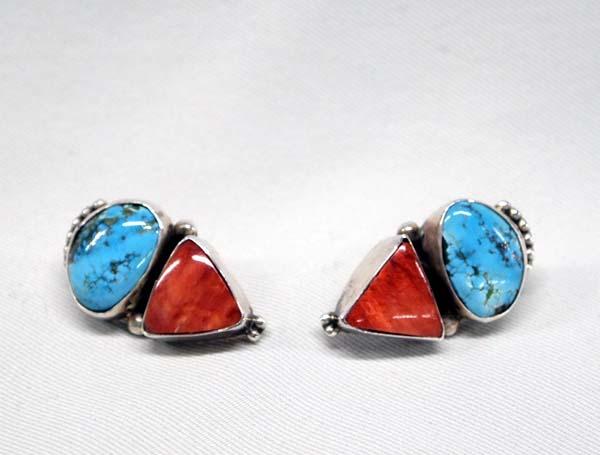Navajo Turquoise, Spiny Oyster, Silver Earrings by Martha Jackson. Measure 1-7/8'' long x 3/4'' wide. Signed on back ''Jackson'' and ''Sterling.'' SHI $15.