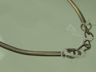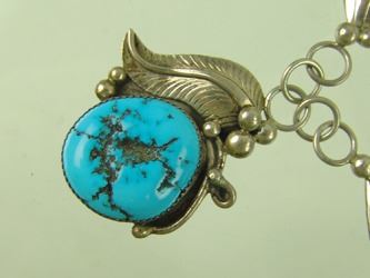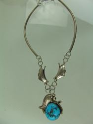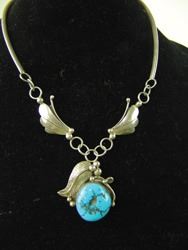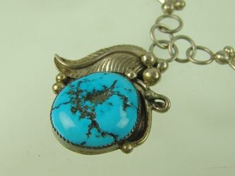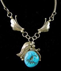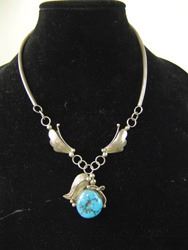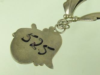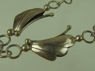 Unique, original design, all silver necklace with leaf work pendant and graceful, sweeping sides. Very good condition. Ca. 1980s. 18", 4" x 1-1/2"