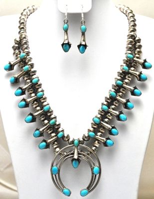 Navajo Turquoise Squash Blossom Necklace & Earrings Set - Phil & Lenore Garcia