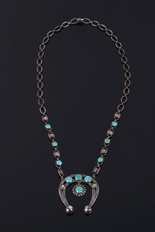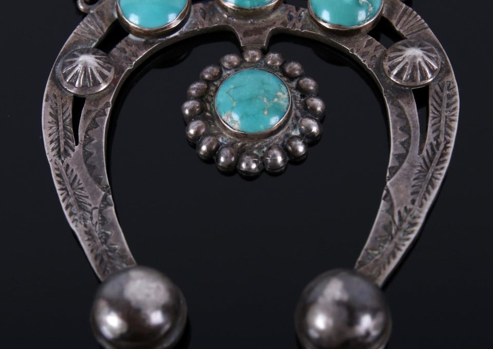 Offered for your bidding pleasure is this Navajo Native American Silver and Turquoise Squash Blossom Necklace. The necklace features a beautifully made naja with intricately stamped detailing set with ten well matched Turquoise Mountain cabochons. The necklace also featured a box style chain with a pearl clasp. This necklace shows wonderful condition and when unclasped it measures 26" long.