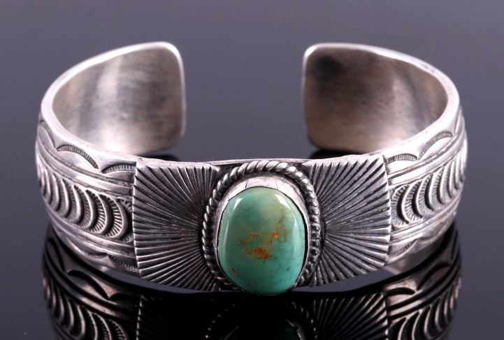This is a signed Navajo Native American Indian sterling silver and turquoise cuff made by Eugene Hale. The bracelet shows a heavy sterling silver construction with deep hand carved and stamped traditional design in an impressive absolutely beautiful design. The cuff is made from solid sterling silver and features a spectacular King's Manassa Turquoise cabochon set in the center. On either side of the turquoise is a hand tooled sunburst pattern flanked by additional hand tooling. The back of the cuff is marked "Sterling" and has been signed by the artist "E. Hale" (Eugene Hale). The Navajo sterling silver cuff is in good condition. It measures 2" x 2.75" and is .75" wide.