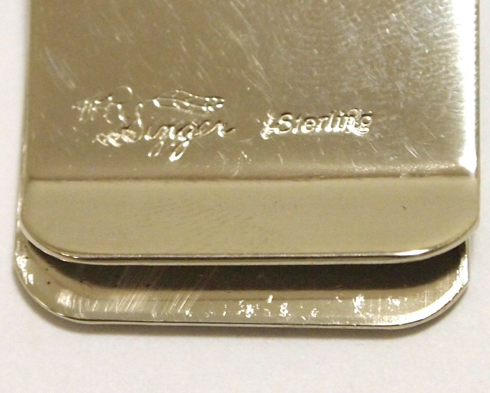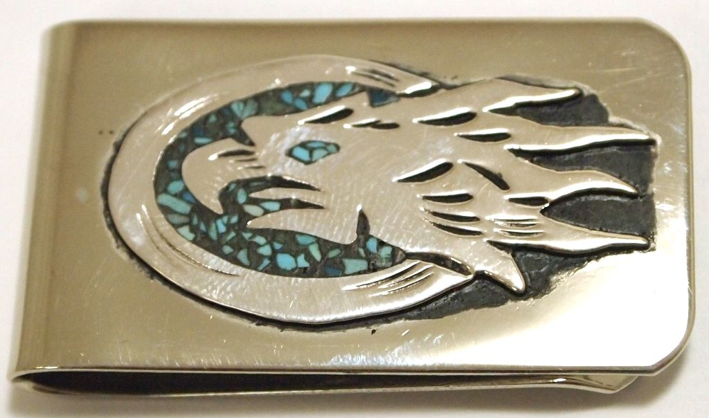 Note: Money clips are nickel or stainless steel as purchased by the artist. The work on top of the money clip features sterling silver.