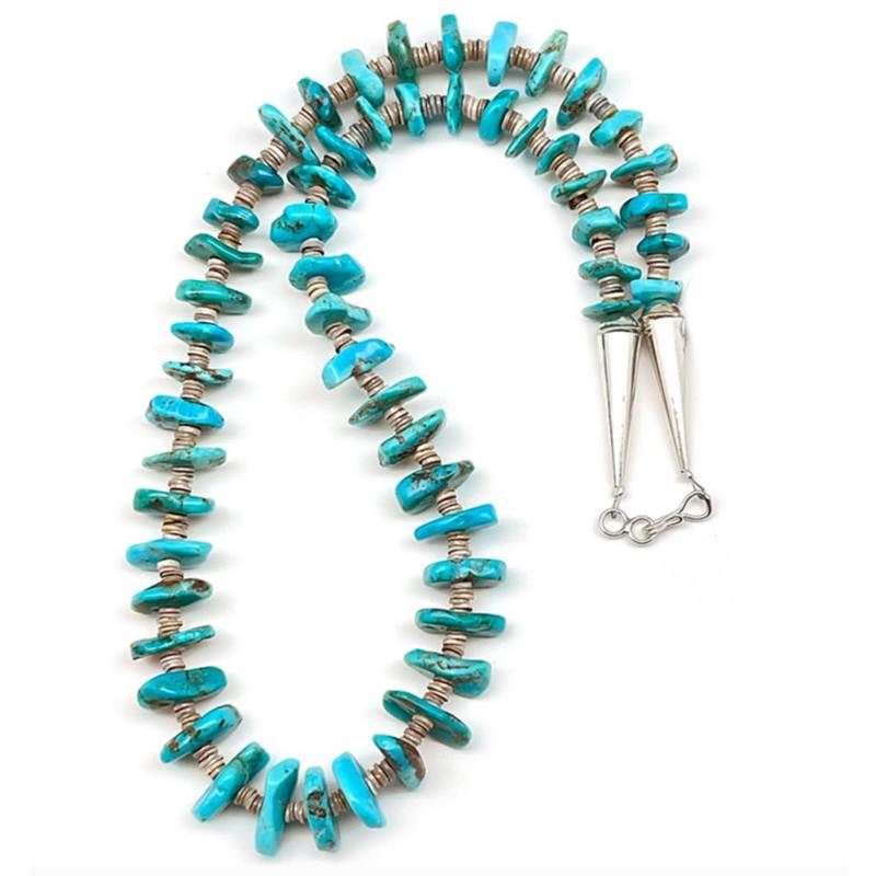 Phenomenal vintage Native American Navajo sterling silver and Kingman turquoise statement heishi nugget bead necklace with shell accents and sterling silver hook & eye closure. * Regional Style: Native American, Southwest * Stone: Turquoise nugget, shell * Size: 20" * Bead Size: varies, graduated design * Color: Blue Turquoise, Shell, Sterling Silver * Tribal Affiliation: Navajo * Base Metal: Sterling Silver hook & eye closure * Material : Turquoise, Sterling, Shell. FREE SHIPPING ON ALL JEWELRY ORDERS WITHIN THE US! WE SHIP ALL ITEMS IN-HOUSE!