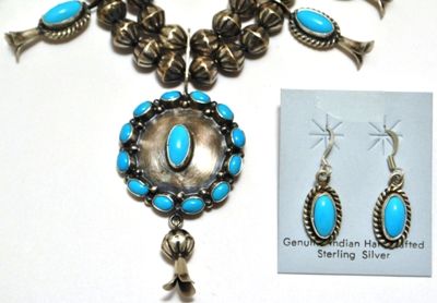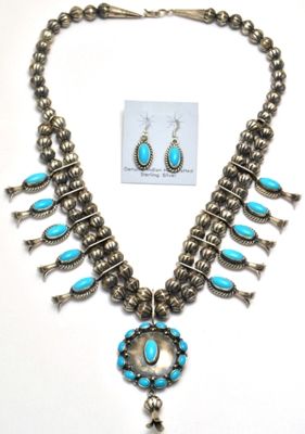 Navajo Turquoise Sterling Silver Squash Blossom Necklace & Earrings Set - L.F.K.