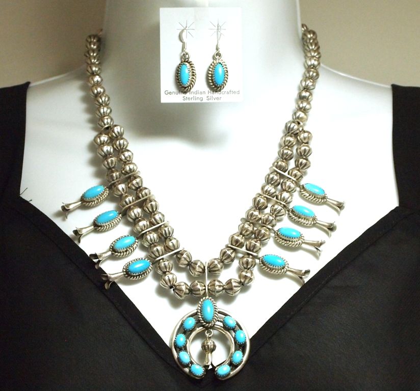 Navajo Turquoise Sterling Silver Squash Blossom Necklace & Earrings Set - L.F.K.