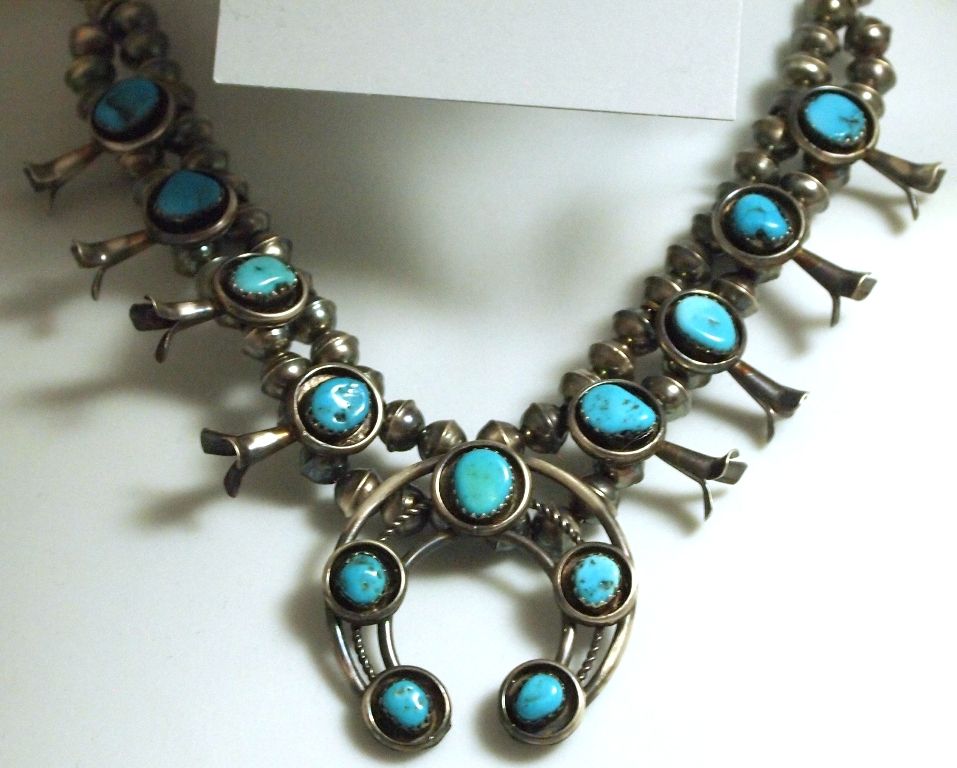 Navajo Turquoise Sterling Silver Squash Blossom Necklace & Earrings Set - Phil & Lenore Garcia
