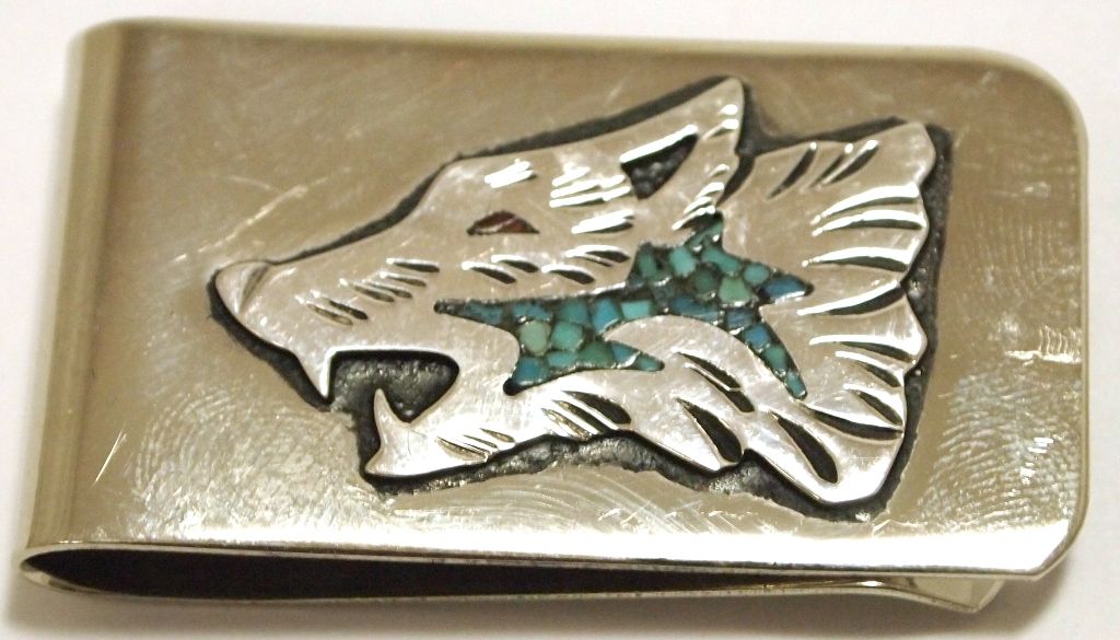 Navajo Turquoise Sterling Silver Wolf Head Money Clip - Richard Singer