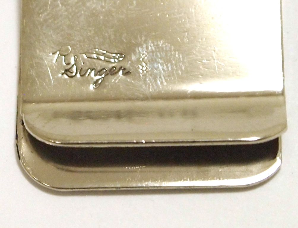 Note: Money clips are nickel or stainless steel as purchased by the artist. The work on top of the money clip features sterling silver.