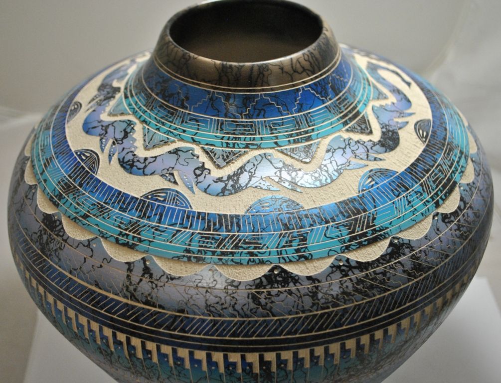 Navajo Turquoise Stone Dragon Etched Pottery - Myron Charley