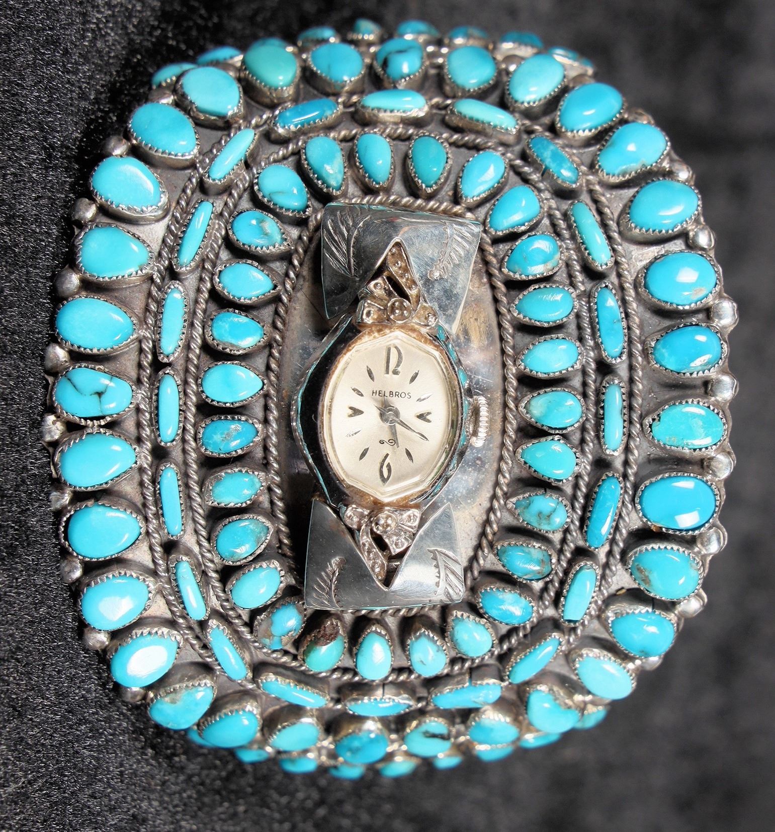 This is a Navajo turquoise watch cuff made by silversmith W. Begay, the cuff is comprised of both petite point and needle point turquoise, the circular center portion of the cuff measures 3 ¼" wide by 2 .5" tall, the piece is signed W. Begay.