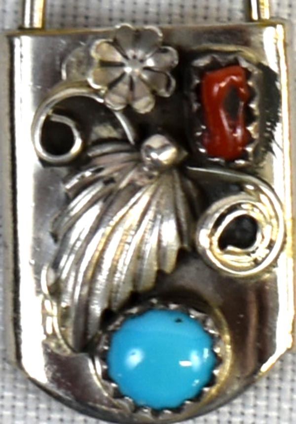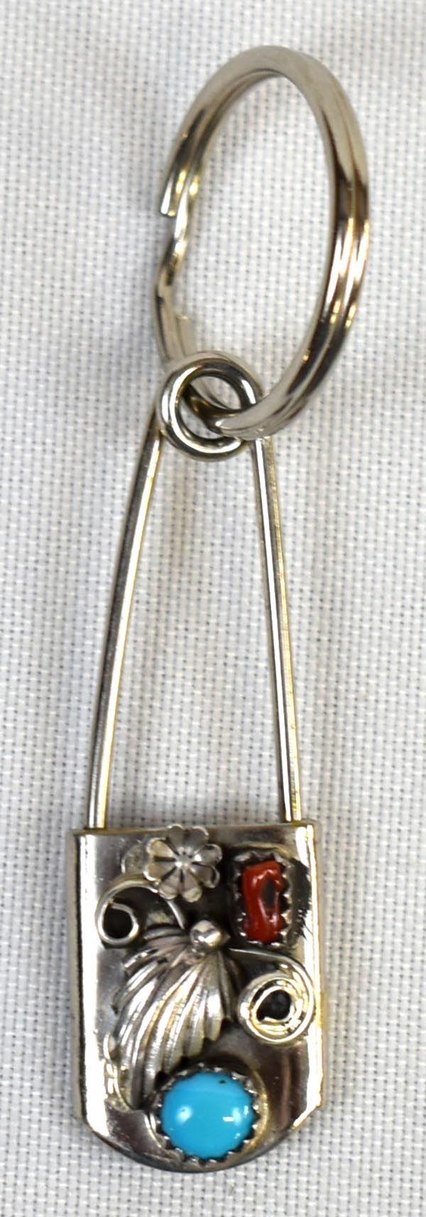 Native American Navajo Turquoise and Coral Safety Pin Key Ring, measures 2'' x .5'', pin itself is not sterling however the work on top is